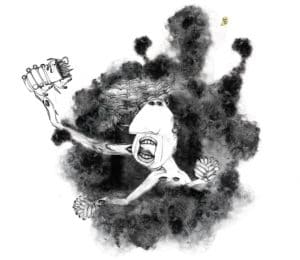Ainsi, la souffrance s’exprime ici par le biais d’êtres ou d’animaux conçus au hasard des envies, à l’apparence non pas difforme, mais bel et bien monstrueuse, comme sont monstrueuses les conséquences de la guerre et des violences de nos sociétés modernes. Le décor, flou, vaporeux, vient poser un espace à l’ambiance morne, sentant la mort et la destruction.