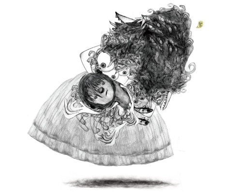 La femme à l’enfant, à gauche de la fresque, est sans doute l’un des personnages clés de ce projet. Son regard vide aux pupilles absentes, sa chevelure sinueuse inspirée de la gorgone Medusa et l’enfant mort dans ses bras font résonner des souffrances très intimes, et expriment une colère indicible, dévastatrice. En plein désarroi et comme pétrifiée, cette créature évoque la silhouette d’un arbre encore enraciné, mais en cours de disparition, d’effacement, comme le sont les sociétés violentées par des événements qui les dépassent.